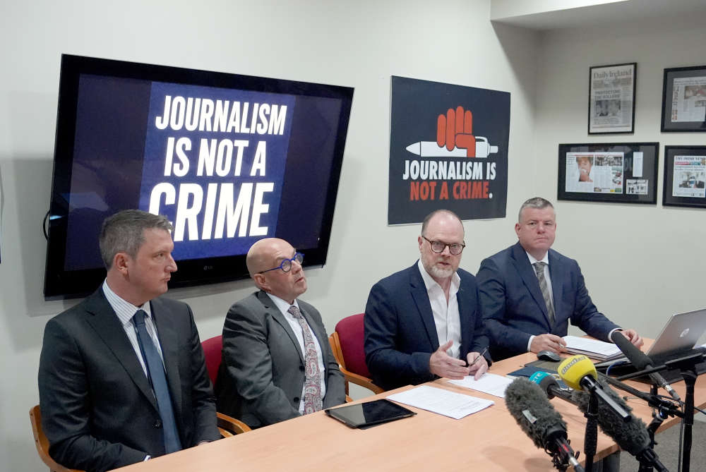 (left to right) Solicitor John Finnucane and journalists Barry McCaffrey, Trevor Birney, and solicitor Niall Murphy speak during a press conference at KRW Law offices in Belfast (Photo by PA)