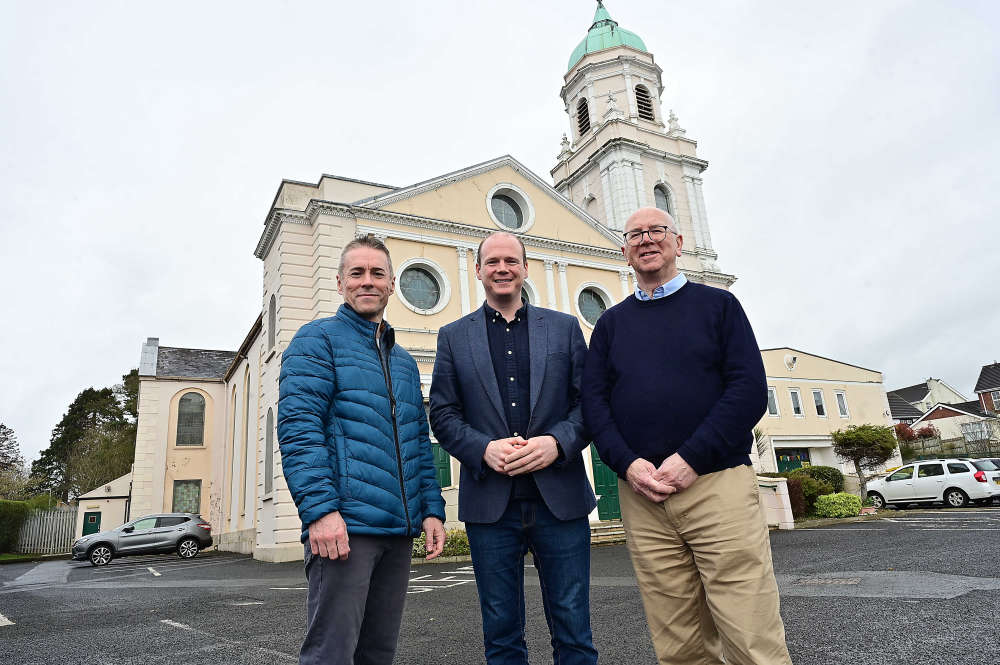 The Department for Communities of Communities Minister Gordon Lyons (centre) with Kerry Rooney (left), National Churches Trust and Richard McChesney, outside Whiteabbey Presbyterian Church in Newtownabbey, as the Minister announced £200,000 in funding towards the long term sustainability of Northern Ireland's historic church buildings (photo by PA)